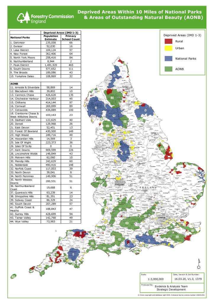 This poster links to Proposal 7 of the Landscape Review ~ a stronger mission to connect all people with our national landscapes; it provides an overview of the most (top 30%) deprived rural and urban areas in England and their populations that are within 10 Miles of our National Parks & Areas of Outstanding Natural Beauty.
