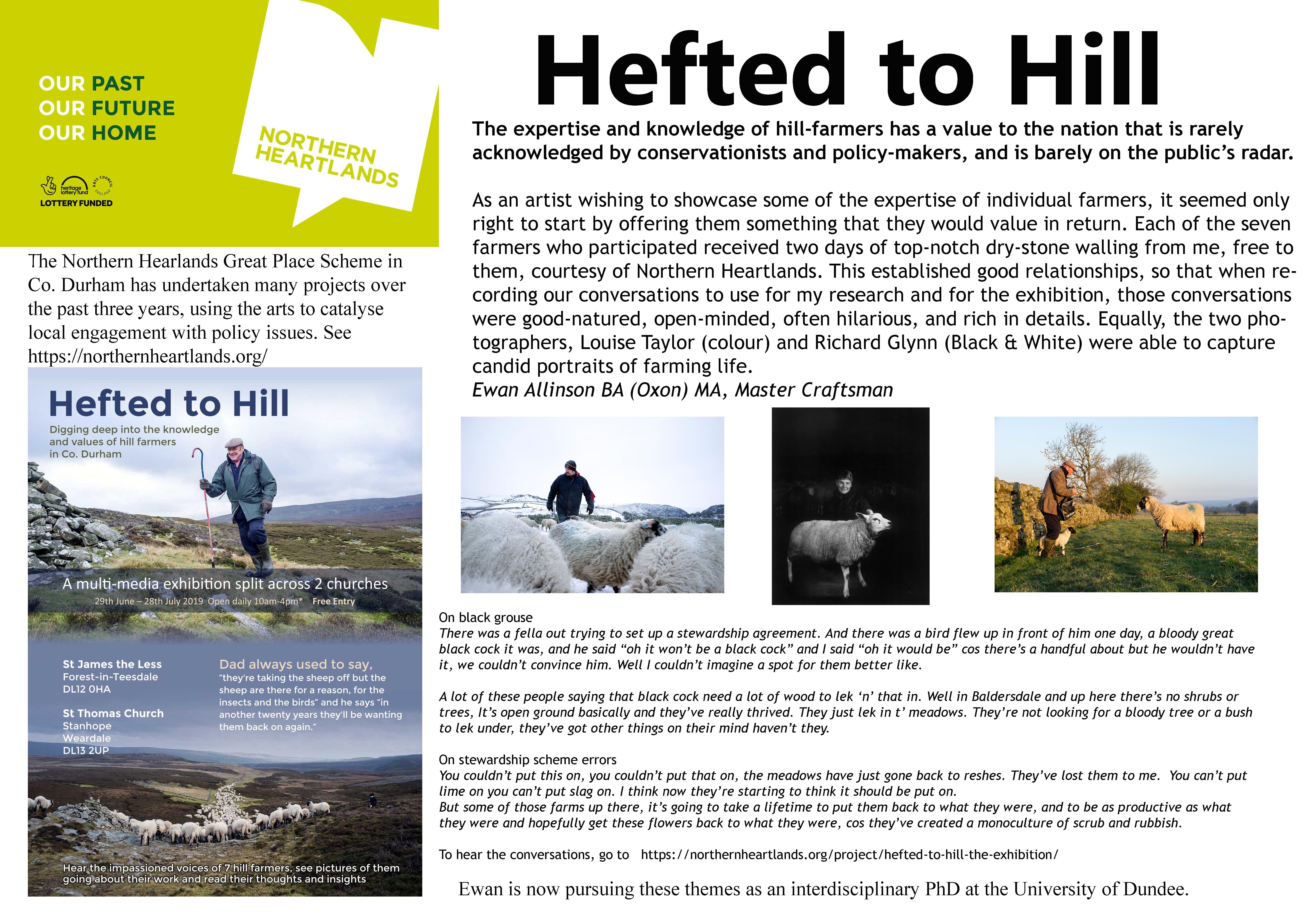 Hefted to Hill was a flagship project for the Northern Heartlands Great Place Scheme in the rural western half of Co. Durham. https://northernheartlands.org/ culminating in an exhibition in 2019.