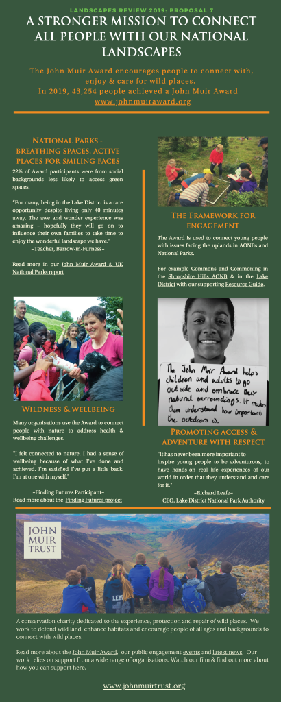 Our poster shows the John Muir Award which encourages people to enjoy, connect with, care and take action for nature. Since 1996 it has reached over 400,000 people, 25% from an ‘inclusion’ background. It is used by a diverse range of partners in all 15 National Parks (and some AONBs) with formal agreements in 3 Parks. We describe the national picture with links to our activity in National Parks, and examples from the Lake District and Shropshire Hills AONB.