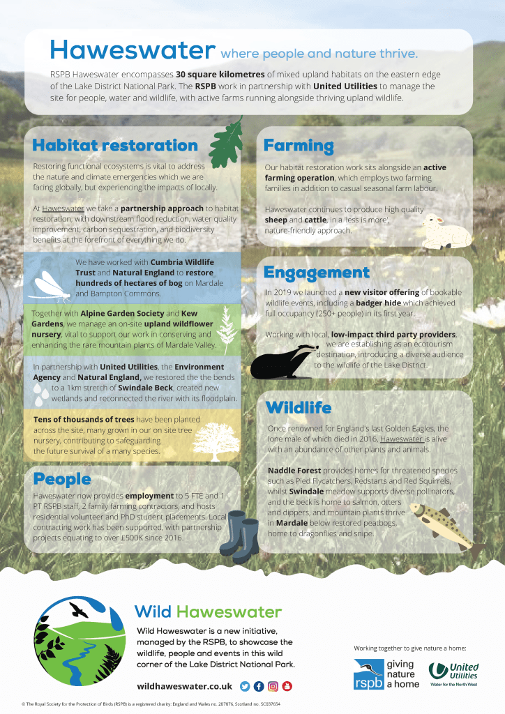 RSPB Haweswater encompasses 30 square kilometres of mixed upland habitats on the eastern edge of the Lake District National Park. The RSPB work in partnership with United Utilities to manage the site for people, water and wildlife, with active farms running alongside thriving upland wildlife. In 2019 a new initiative, ‘Wild Haweswater’ was launched to showcase the wildlife, habitat restoration, and events on site, engaging a wider audience with the natural heritage of the area.